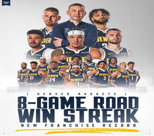 据统计,本场比赛过后,掘金目前的客场连胜纪录已经延续到了8场,创造了新的队史纪录。