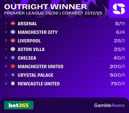 北京时间12月22日,在英超第17轮的大部分比赛结束后,Squawka更新了英超的夺冠赔率,本轮主场2-1战胜曼联,豪取各项赛事10连胜和英超7连胜的阿斯顿维拉升至并列第三位,仅次于阿森纳和曼城。