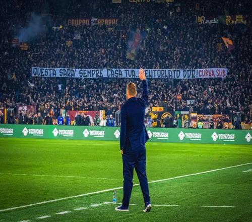 德罗西看到这些横幅也颇为感动,他多次向看台鼓掌并亲拍自己的胸口,表达对于罗马球迷的感谢。即便热那亚连丢两球,球迷仍高唱那首熟悉的德罗西专属助威歌曲。终场哨响,德罗西绕场致意,再次感谢了罗马球迷对于自己的认可。