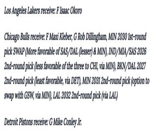 这笔交易还涉及洛杉矶湖人,他们送走道尔顿·克内希特、马克西·克莱伯以及一个颇具价值的2032年次轮选秀权,得到艾萨克·奥科罗。奥科罗是一个运动能力出色的侧翼防守者,这正是湖人队急需的球员类型。自2023-24赛季以来,他的三分球命中率达到38.1%,本赛季在芝加哥公牛队的外线命中率也有37.8%。