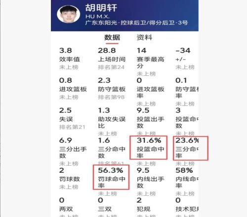 现在网络上流传一句话:广东队也有一个“高铁”,甚至比山东高铁还离谱。不说不知道,一查吓一跳。经过查看数据,胡明轩本赛季真的是比山东高铁还离谱。高诗岩的三项命中率是41%、37%、68%,而胡明轩是31%、23.6%、56.3%,投篮命中率、三分命中率和罚球命中率都比山东高铁低。你难以想象,顶薪球员和队长的罚命中率不到6成,三分命中率只是2成多。胡明轩本赛季真是中了邪了。