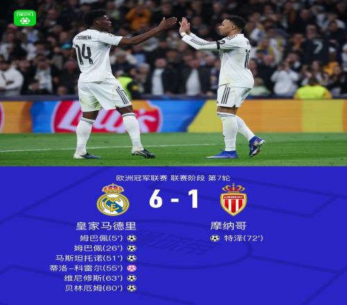 北京时间1月21日欧洲冠军联赛 联赛阶段 第7轮,皇家马德里对阵摩纳哥。上半场,巴尔韦德和维尼修斯相继助攻,姆巴佩完成双响。下半场,维尼修斯助攻,马斯坦托诺收获个人欧冠处子球。